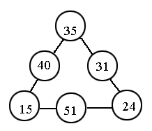 在○里填上合适的数,使每条边上的三个数相加都得90(按左、下、上的顺序填)