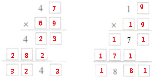 分析:(1)因为第一次乘得的积是三位数且最高位是4,所以下面因数的个位上是9,则上面的因数的个位上最小是5,若上面因数的个位上是5,则第一次乘得的积是405,则第二次乘得的积的末尾应该是4,任何数与5相乘的末尾都不是4,不符合题意;若上面因数的末尾是6,则第一次乘得的积是414,那么第二次乘得的积的末尾就是4-1=3,任何数与6相乘的末尾都不是3,不符合题意;若上面因数的个位上是7,则第一次乘得的积是423,那么第二次乘得的积的末尾就是4-2=2,因为7×6=42,所以下面因数的十位上是6,47×69=3243,符合题意;