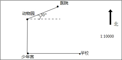 学校正西方向500米是少年宫,少年宫正北方向300米是动物园,动物园东偏北30°的200米处是医院.先确定比例尺,画出上述地点的平面图.