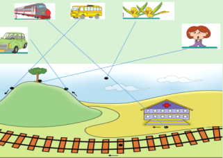 Look! The birds are in the blue sky. The car is going up a hill. The bus is going down the hill. And the train is going past the hospital. Wow, there is a girl. The girl is under the tree.
