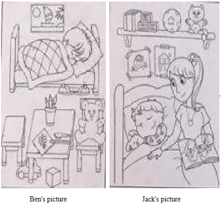 【1】下面两段话是Ben和Jack对其图画的介绍,请判断哪段话是谁讲的,在相应的括号内填写Ben或Jack
