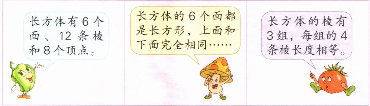 | 长方体有6个面、12条棱和8个顶点。 | 长方体的6个面都是长方形,上面和下面完全相同…… | 长方体的棱有3组,每组的4条棱长度相等。 |