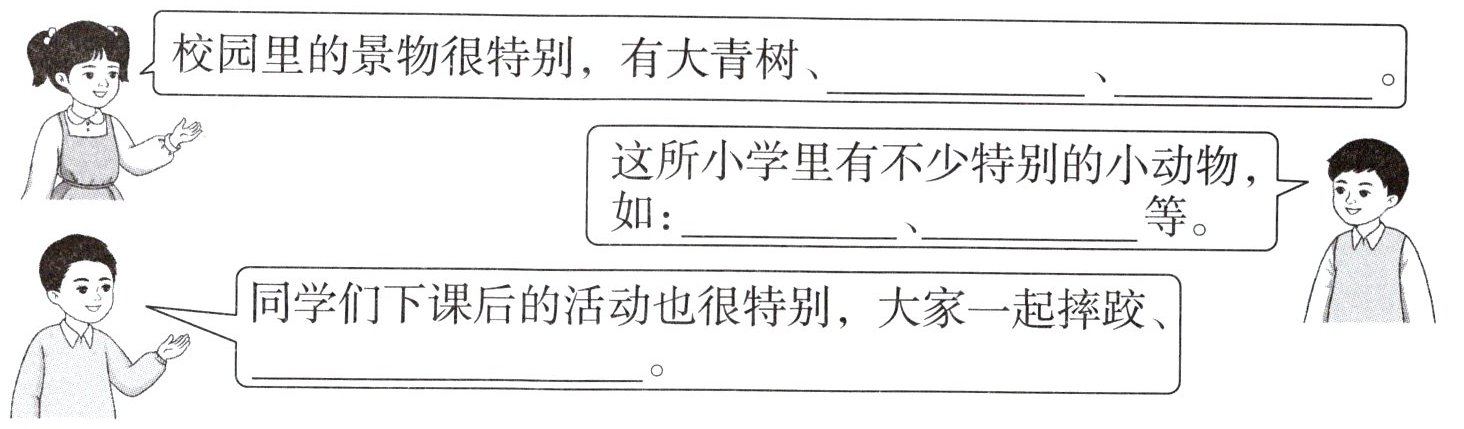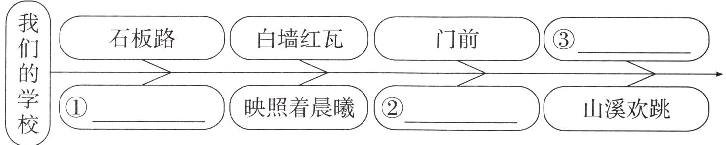 (huáng huàng)。}$$\overset{1. 选择正确的汉字或读音,画“√”。}$$\overset{2. 看拼音,写字词。}$$\overset{能力闯关岛}$$\overset{二、根据课文内容,完成练习。}$$\overset{学完《大青树下的小学》,同学们热烈地讨论了这所小学的特别之处。请你}$$\overset{根据课文内容,把下面的对话补充完整。}$$\overset{校园里的景物很特别}\overset{如:}\overset{同学}\overset{们下课后的活动也很特别,大家一起摔跤、}\overset{阅读训练营}$$\overset{三、阅读短文,完成练习。}$$\overset{我们的学校}$$\overset{李先轶}$$\overset{我们的学校,坐落在大山的怀抱里,一半在云里,一半在雾里。从校门口铺}$$\overset{出的石板路,弯弯曲曲,伸到山脚平地。}$$\overset{我们的学校,坐落在浓密的竹林里,白墙红瓦,映照着东方的晨曦(xī)。门}$$\overset{前翠竹掩蔽;窗后,山溪欢跳……}$$\overset{山,,。}$$\overset{当清脆的上课铃声响起,孩子们像喜鹊似的飞进了教室。一双双眼睛在探}$$\overset{求,一只只耳朵在谛(dì)听。顿时,琅(láng)琅书声从窗口飞入云际,和山雀对}$$\overset{话,和竹林絮(xù)语……}$$\overset{(选自《语文新天地》,有改动)}$$\overset{1. 品读第 1、2 自然段,完成下面的思维导图。}$$\overset{我们的学校}$$\overset{2. 从画线的句子中可以感受到,在这里读书的学生生活非常}$$\overset{3. 第 4 自然段主要描写了( )的场景。}$$\overset{A. 课外活动时 B. 下课后 C. 上课时}$