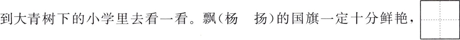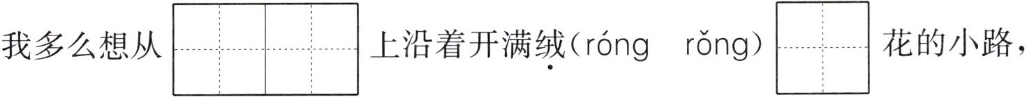 我多么想从$\begin{array}{|c|c|}\hline & \\\hline & \\\hline\end{array}$\begin{array}{|c|c|}\hline & \\\hline & \\\hline $$\overset{shān pō}{}上沿着开满\overset{绒}{(róng rǒng)}$$\begin{array}{|c|c|}\hline & \\\hline & \\\hline\end{array}$\begin{array}{|c|c|}\hline & \\\hline & \\\hline $$\overset{qiú}{}$花的小路,到$\overset{大青树下的小学里去看一看。飘(杨 扬)的国旗一定十分鲜艳,}$$\begin{array}{|c|c|}\hline & \\\hline & \\\hline\end{array}$\begin{array}{|c|c|}\hline & \\\hline & \\\hline $$\overset{gǔ}{}$$\begin{array}{|c|c|}\hline & \\\hline & \\\hline\end{array}$\begin{array}{|c|c|}\hline & \\\hline & \\\hline $$\overset{lǎo}{}的铜钟挂在\begin{array}{|c|c|}\hline & \\\hline & \\\hline\end{array}\begin{array}{|c|c|}\hline & \\\hline & \\\hline $$\overset{cū zhuàng}{}$的枝干上,(凤 风)尾竹的影子在$\begin{array}{|c|c|}\hline & \\\hline & \\\hline\end{array}$\begin{array}{|c|c|}\hline & \\\hline & \\\hline $$\overset{jié}{}$$\begin{array}{|c|c|}\hline & \\\hline & \\\hline\end{array}$\begin{array}{|c|c|}\hline & \\\hline & \\\hline $$\overset{bái}{}的\overset{
