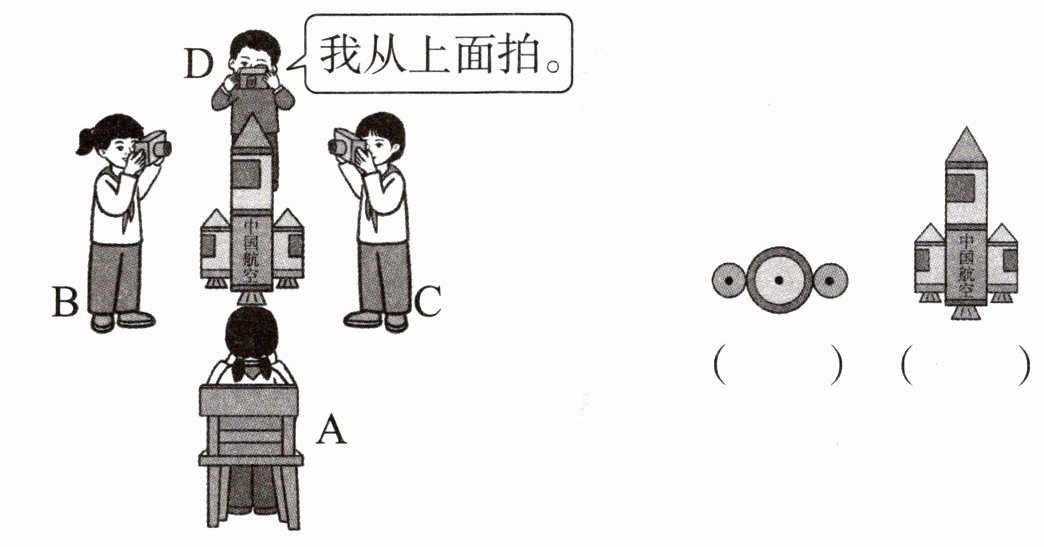 二、右边两张火箭模型的照片分别是在什么位置拍摄的?选一选。