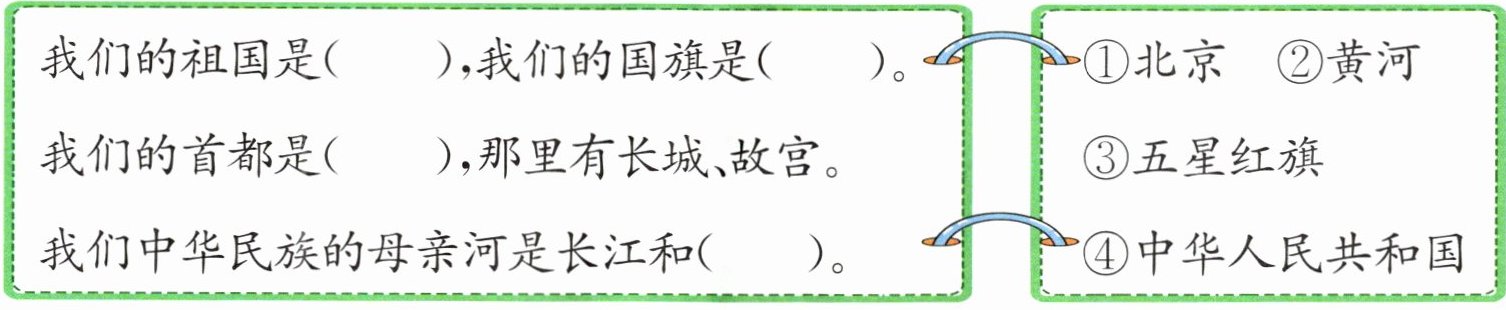 我们的祖国是( ),我们的国旗是( )。①北京 ②黄河