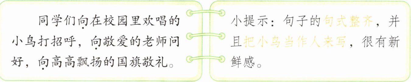 小提示:句子的句式整齐,并且把小鸟当作人来写,很有新鲜感。