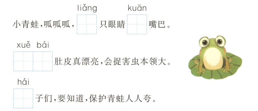 二、实验班原创 语言运用 小蝌蚪最终长成了青蛙,让我们来夸一夸他。看拼音,把儿歌补充完整。