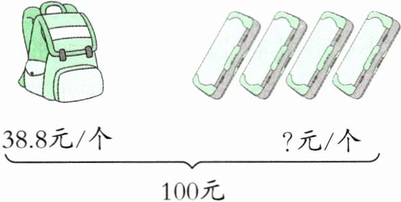 答案: 100-38.8=61.2(元) 61.2÷4=15.3(元/个) 【提示】先求出买一个书包后还剩多少元,再用剩的钱数除以文具盒的数量即可得到文具盒的单价。