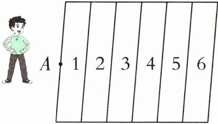 4. 如图,每条跑道宽 $\frac{4}{5}\ \text{m}$,小华立定跳远的平均成绩为 $\frac{5}{3}\ \text{m}$,现在小华从跑道的左边线 $A$ 点处起跳,他正常发挥,跳 3 次能跳过第六条跑道右侧边线吗?(跑道间的分界线宽度不计)