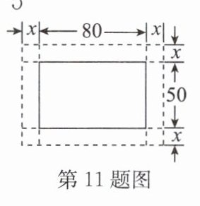 11. 如图,在一幅长 $ 80 \, \mathrm{cm} $,宽 $ 50 \, \mathrm{cm} $ 的矩形风景画的四周镶一条金色纸边,制成一幅矩形挂画,设整个挂画总面积为 $ y \, \mathrm{cm}^{2} $,金色纸边的宽为 $ x \, \mathrm{cm} $,则 $ y $ 与 $ x $ 的函数表达式是