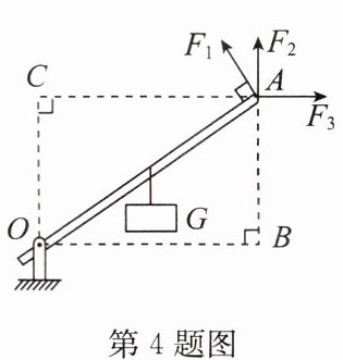 4. 如图所示,杠杆OA可绕O点转动,在其中点挂一重物,现在A点分别施加$F_1、$$F_2、$$F_3$三个力的作用,则: