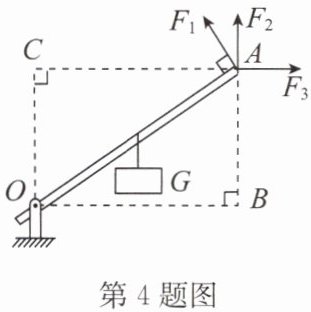 4. 如图所示,杠杆OA可绕O点转动,在其中点挂一重物,现在A点分别施加$F_{1}$、$F_{2}$、$F_{3}$三个力的作用,则: