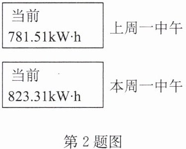 2. 某同学家中一周前、后电能表的示数如图所示,该同学家上周一中午至本周一中午这段时间消耗的电能为