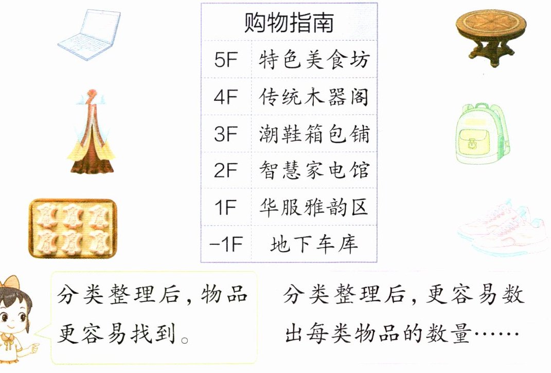 【点拨】通过仔细观察物品和购物指南中各楼层的商品类别,就能准确地完成物品与楼层的连线。