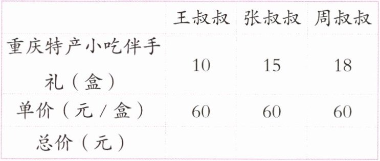 6. 新情境·地方特产 三位叔叔去重庆出差,回来的时候买了重庆特产小吃礼包。请你帮三位叔叔算一算,他们各花了多少元?