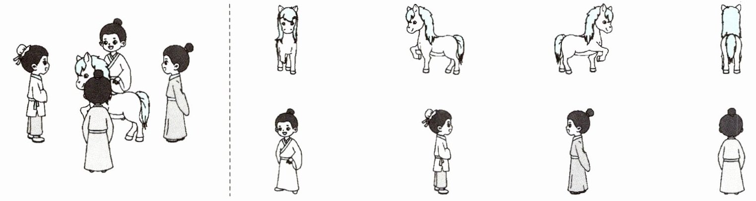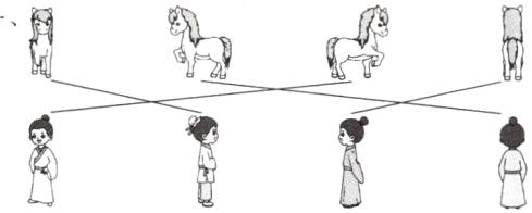 一[新情境]有一次,董卓送给吕布一匹赤兔马,吕布十分高兴,带领部下去看赤兔马。吕布和几位部下看到的分别是什么?连一连。