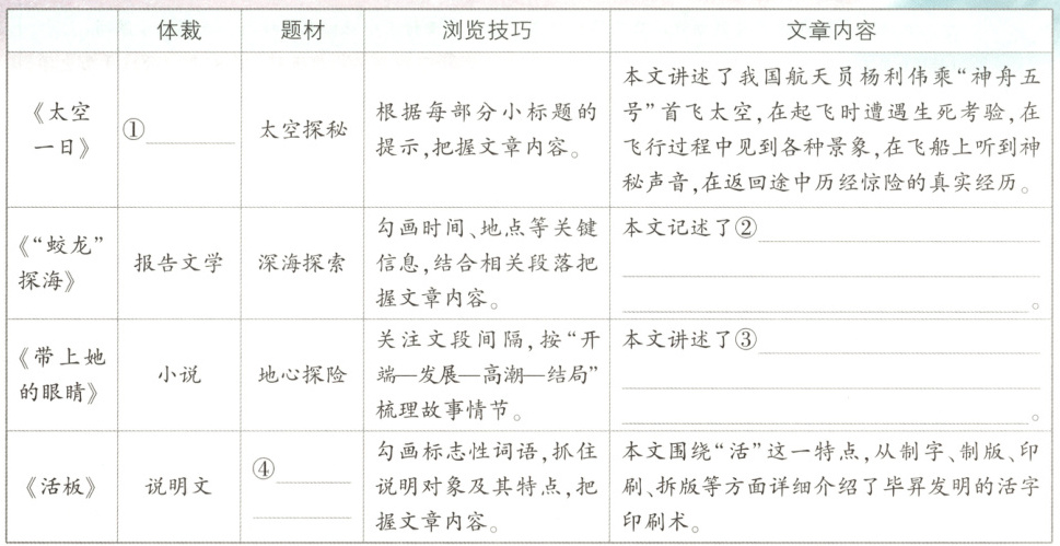 [参考答案] ①传记 ②中国载人潜水器“蛟龙号”于2012年6月24日在西太平洋坐底7020米,创造中国、世界纪录,并与“神舟九号”海空连线的激动人心的瞬间 ③“我”带着与小姑娘相同的传感眼镜度假,带着她游览草原,后来得知她是因事故被困地心的“落日六号”的领航员的故事 ④技术创新