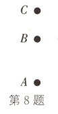 8. 如图所示,将小球竖直向上抛出,小球在A、B、C三点的速度分别为$v_A = 4\ m/s$、$v_B = 2\ m/s$、$v_C = 0$。若小球在经过B点时,重力突然消失,则小球将做_______运动,速度大小为_______;若小球在C点时,重力突然消失,则小球将_______。(不考虑空气阻力)