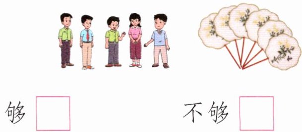 5. (地域特色)苏绣起源于苏州,是四大名绣之一。妈妈去苏州时买了苏绣团扇送给下面的朋友,每人送1把够吗?在$□$里画“√”。