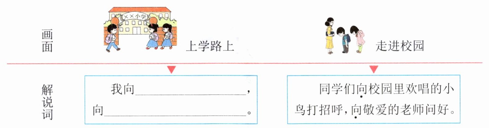 场景拍摄 二、请你仿照例句,为校报的配图补全解说词。