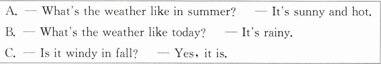1. — What's the weather like in spring? — It's rainy. 2. — What's the weather like today? — It's cloudy. 解析:此题要求学会询问天气,应该用句型"What's the weather like +时间状语?",当时间是季节时,应该用介词in。此题中时间是 today,前面不要加任何介词。其答句句型是"It's +表示天气的形容词."。 3. — What's the weather like today? — It's sunny.