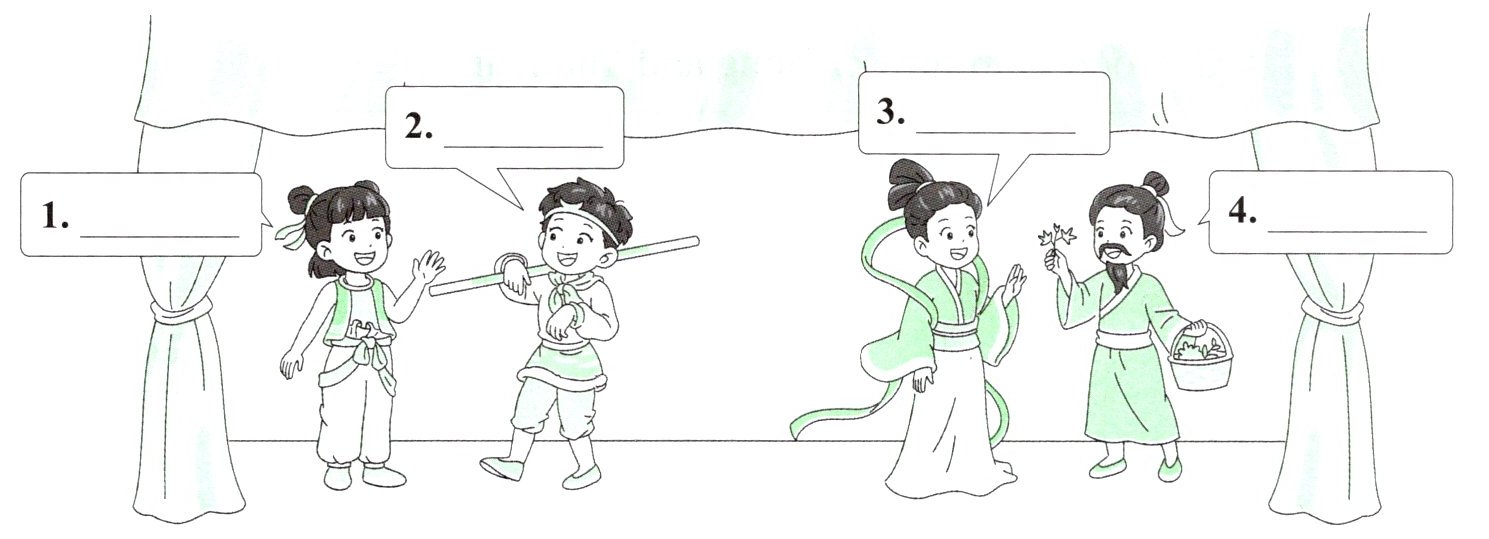 三、[中华优秀传统文化]复兴小学话剧社正在排练新节目《神话人物面对面》。看图,选择正确的选项补全对话,将序号写在横线上。
