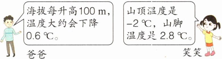 解析:山顶和山脚的温度差是2 + 2.8 = 4.8(℃)。因为海拔每升高100 m,温度大约会下降0.6℃,所以只要求出4.8℃里有多少个0.6℃,就可以知道火焰山的主峰有多少个100 m高。