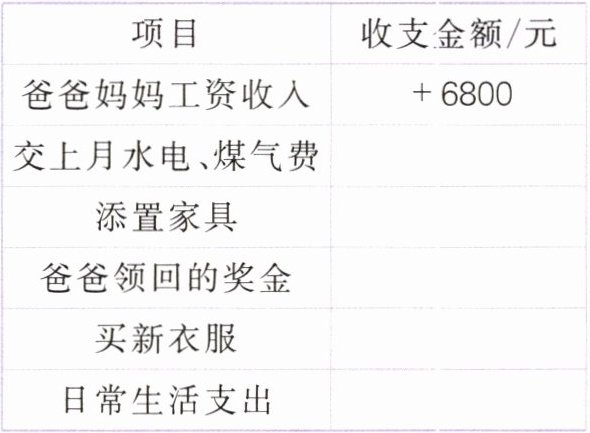 4浩浩家2月份的家庭收支情况如下:爸爸妈妈工资收入为6800元;交上月水电、煤气费240元,添置家具需2000元,爸爸领回奖金1500元,买新衣服需1000元,日常生活支出1200元。请根据以上信息填写表格。你能算出浩浩家2月份的余额吗?