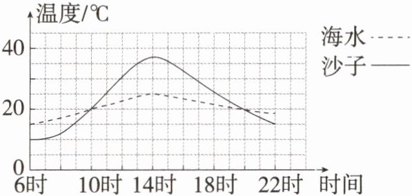 4. 「2024山东青岛中考」(多选)小明在海边玩耍,感觉沙滩上的沙子很热,海水却比较凉爽。某天,他从6时到22时对沙子和海水的温度进行了测量,绘成的温度随时间变化图像如图所示。下列分析正确的是 (
