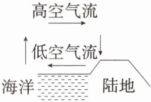 解析 水的比热容比干泥土、沙石的大,白天太阳照射时,海面温度上升得慢,陆地温度上升得快,热空气上升,冷空气补充,风从海面吹向陆地,形成海风;夜晚,气温下降,海面温度下降得慢,温度高一些,热空气上升,风从陆地吹向海面,形成陆风;由图可知,此时地面附近的空气从陆地吹向海洋,形成陆风,故出现如图所示风向时,通常发生在夜晚,且海水温度较高。