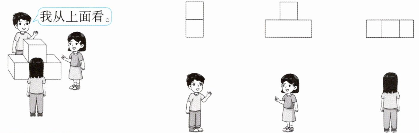 (此处需根据实际插图中人物位置与图形的对应关系连线,因未提供具体插图细节,无法给出准确连线结果,实际答题时应将看到三个横向正方形的人与第三个图形相连,看到下层三个上层中间一个的人与第二个图形相连,看到两个纵向正方形的人与第一个图形相连)