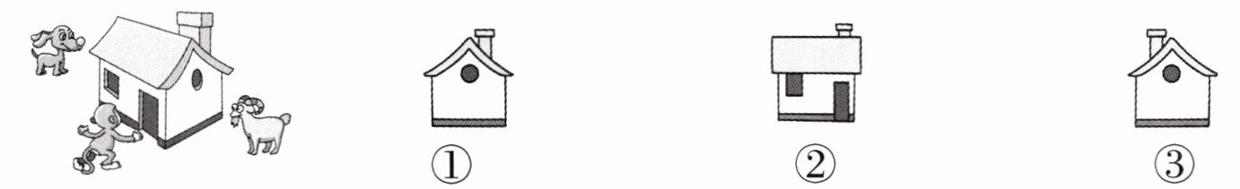 小狗看到的是图( );小猴看到的是图( );小羊看到的是图( )。