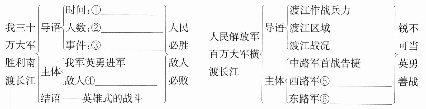 ①二十一日 ②约三十万 ③渡过长江 ④纷纷溃退 ⑤所向披靡 ⑥战绩辉煌