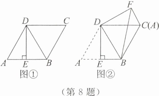 8. 如图①,菱形$ABCD的边长为2$,点$E是AB$的中点,且$DE\perp AB$。