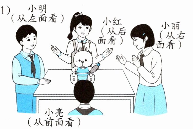 1. 下面各幅图分别是谁看到的?把相应的名字填在( )里。