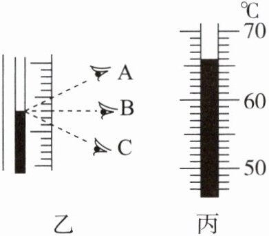 (选填“A”“B”或“C”)方法读数是正确的。如图丙所示,实验中某时刻温度计示数为66