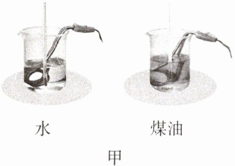 相同的水和煤油,分别倒入烧杯中,用电加热器加热,当它们吸收相同的热量时,通过比较升高的温度