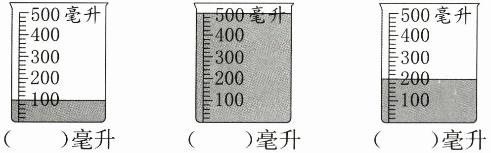 4. 先观察下面的三个量杯里各有多少毫升水,再填一填。
