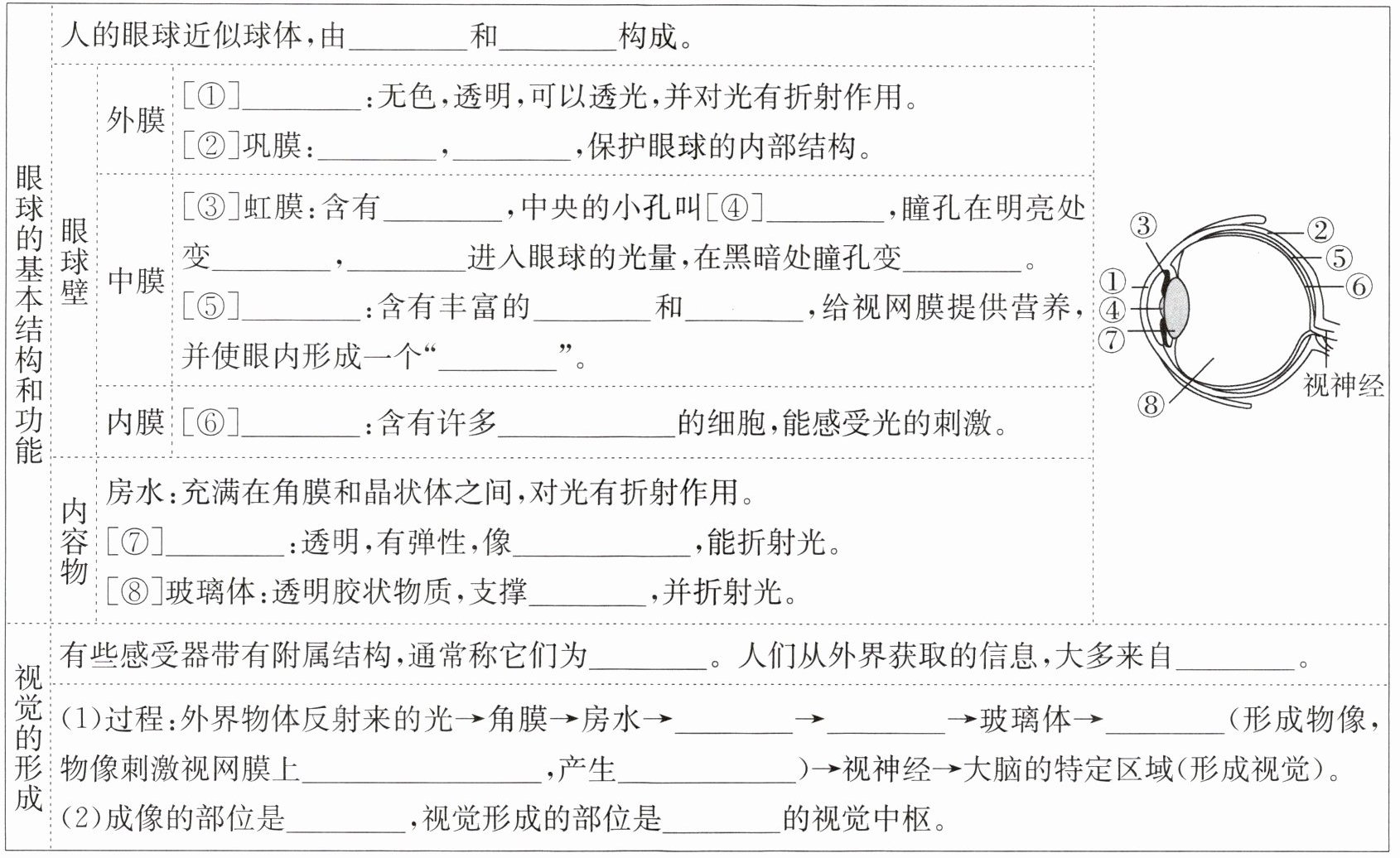 眼球壁 内容物 角膜 白色 坚韧 色素 瞳孔 小 减少 大 脉络膜 血管 色素 暗室 视网膜 对光敏感 晶状体 双凸透镜 眼球壁 感觉器官 视觉