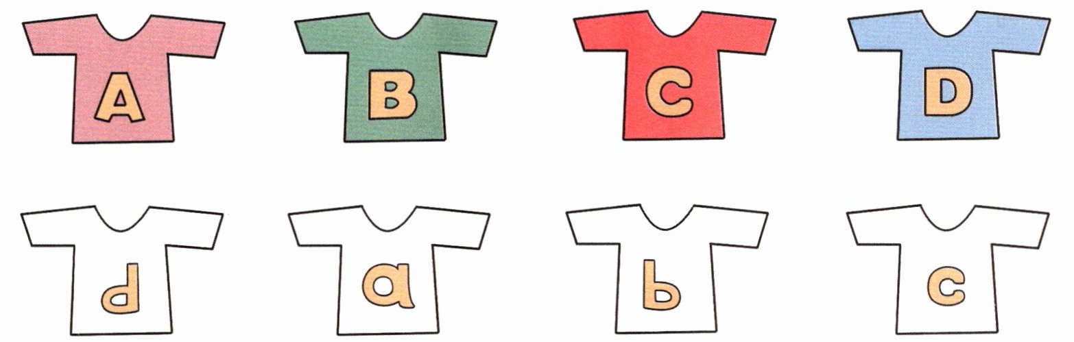 二、新考法 涂色能手 看图片,找出与大写字母对应的小写字母的T恤衫,并涂上相同的颜色。