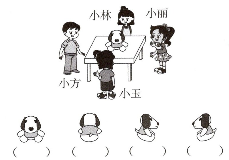 2. 下面的四幅图分别是谁看到的?请在括号里写上小朋友的名字。