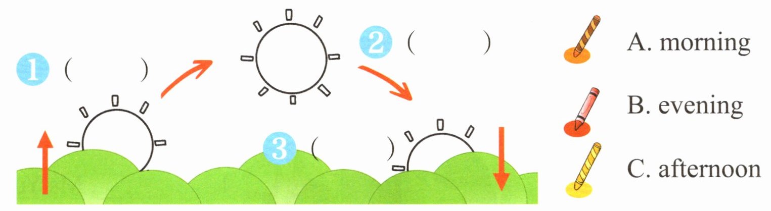 此题考查学生是否能根据图片信息提示,辨别太阳在早上、下午和傍晚的不同位置。第一个太阳正在升起,判断为 morning;第二个太阳位置最高,判断为 afternoon;第三个太阳正在落下,判断为 evening。