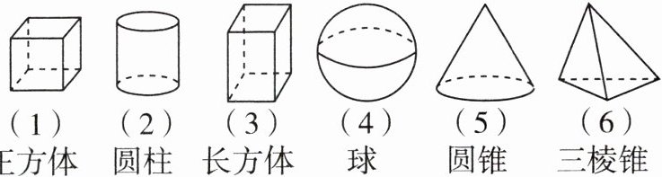 4 [2025 毕节七星关区月考]将如图所示的几何体分类,柱体有______,锥体有______,球体有______。(填序号)
