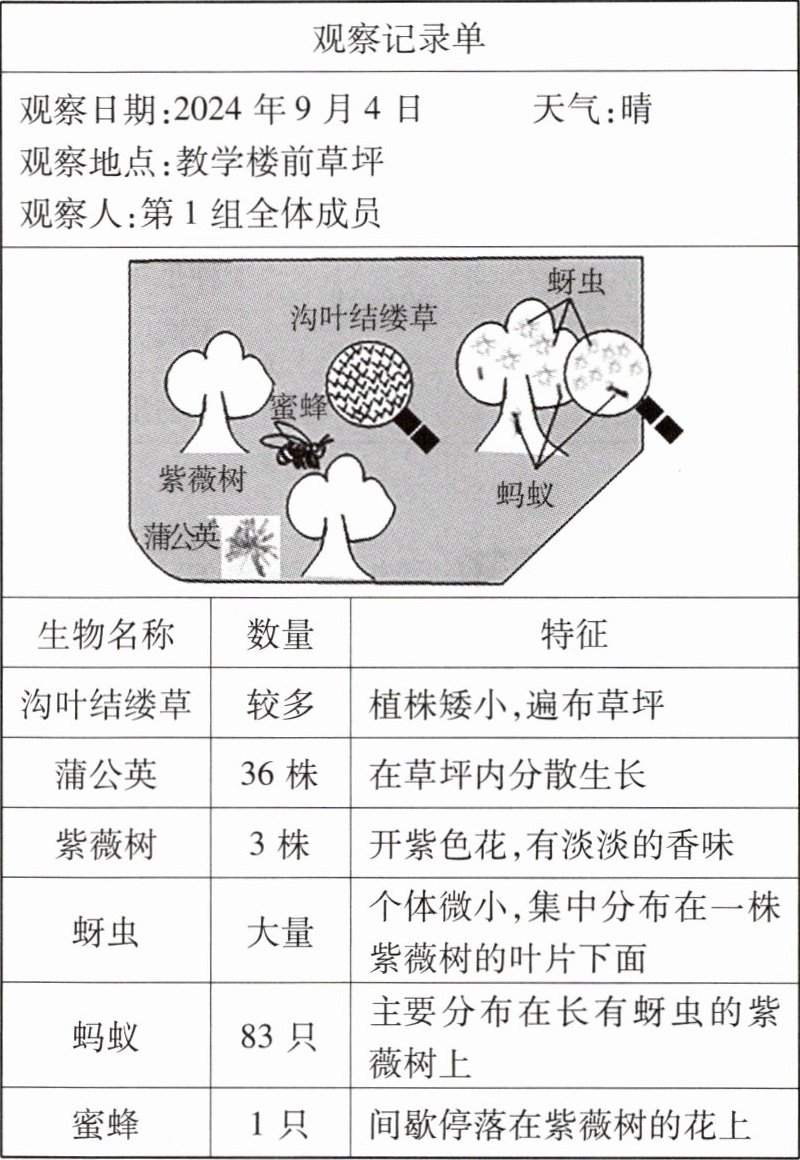 (填“应该”或“不应该”)删除。(4)小明在分析观察记录单时发现蚂蚁和蚜虫都集中分布在同一株紫薇树上,请你帮小明提出一个具有探究价值的问题。