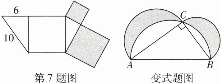 变式 6 因为∠ACB=90°,AB=5,AC=4,所以BC²=AB²-AC²=9,所以BC=3,$S_{△ABC}= \frac{1}{2}BC·AC= \frac{1}{2}×3×4=6,$设以BC为直径的半圆的面积为S₁,以AC为直径的半圆的面积为S₂,以AB为直径的半圆的面积为S₃,因为$S₁= \frac{1}{2}π·(\frac{1}{2}BC)²= \frac{π}{8}BC²,$$S₂= \frac{1}{2}π·(\frac{1}{2}AC)²= \frac{π}{8}AC²,$$S₃= \frac{1}{2}π·(\frac{1}{2}AB)²= \frac{π}{8}AB²,$所以$S_{阴影}=S₁+S₂+S_{△ABC}-S₃= \frac{π}{8}(BC²+AC²-AB²)+S_{△ABC}=S_{△ABC}=6。$