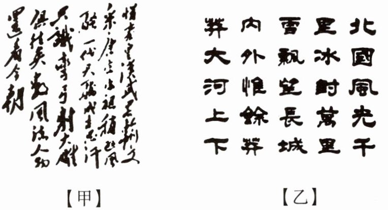 【甲】作品灵动、飘逸、洒脱的草书(行草)形式,与这首词壮阔豪迈的意境、作者豪放的风格形成了有机的统一。