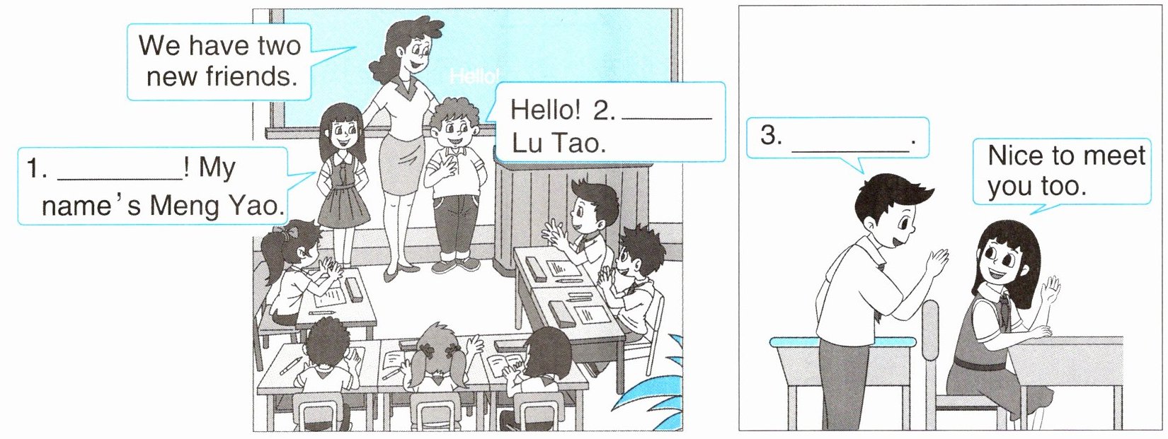 丽丽的班里来了两位新朋友,请读一读,补全对话。