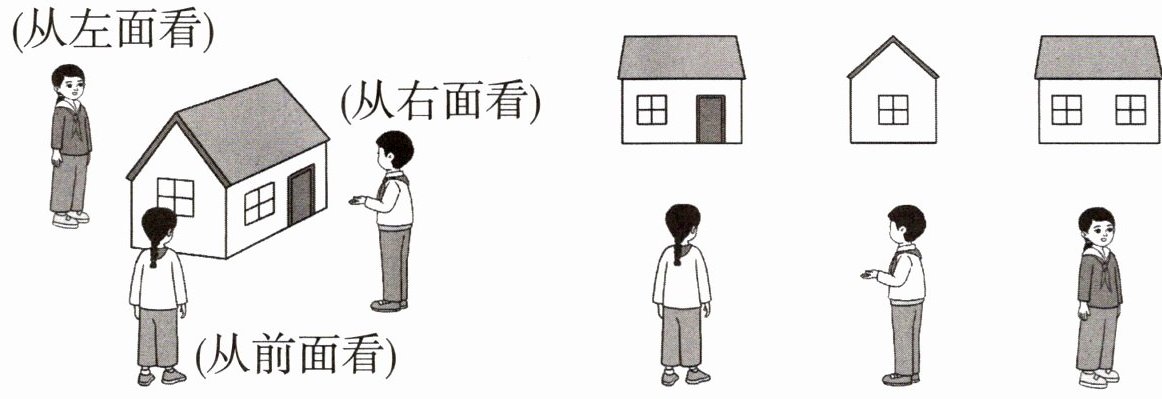 1. 三名同学分别看到的是房子模型的哪一面?连一连。