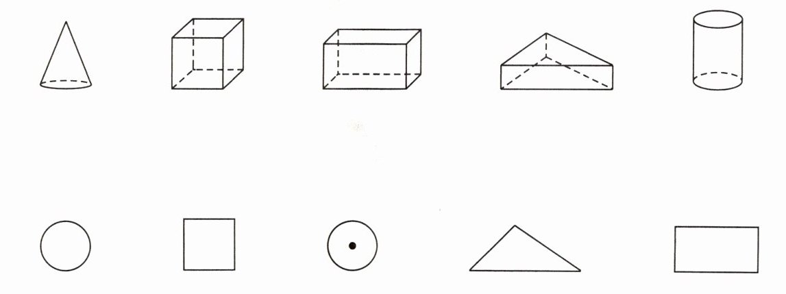 圆锥连带圆心的圆,正方体连正方形,长方体连长方形,三棱柱连三角形,圆柱连圆。